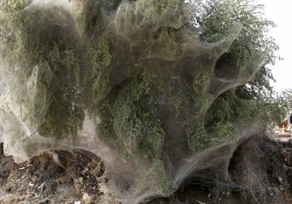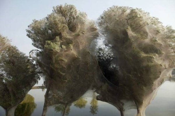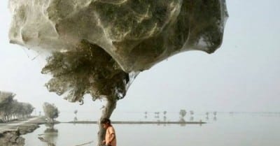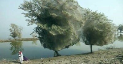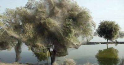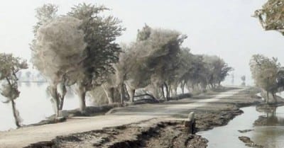 An unexpected side-effect of the flooding in parts of Pakistan has been that millions of spiders climbed up into the trees to escape the rising flood waters. Because of the scale of the flooding and the fact that the water has taken so long to recede, many trees have become cocooned in spiders webs. People in this part of Sindh have never seen this phenonemon before – but they also report that there are now less mosquitos than they would expect, given the amoungt of stagnant, standing water that is around. It is thought that the mosquitos are getting caught in the spiders web thus reducing the risk of malaria, which would be one blessing for the people of Sindh, facing so many other hardships after the floods. UK aid – in response to the Pakistan floods – is helping millions of survivors return home and rebuild their lives.